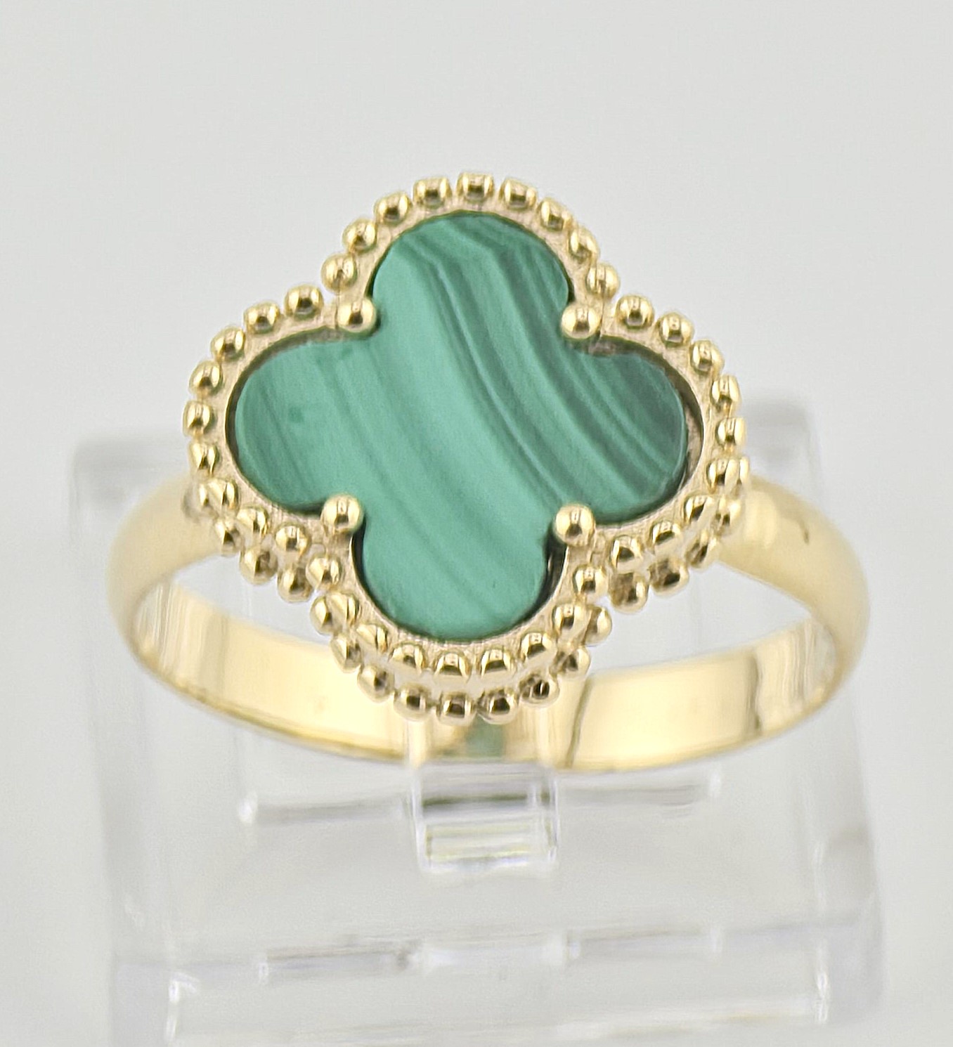 Elevate your style with this elegant 14K yellow gold ring, featuring a polished malachite clover centerpiece framed with delicate beaded gold detailing. The natural green swirls of the malachite stone bring a touch of luxury and uniqueness to every look.