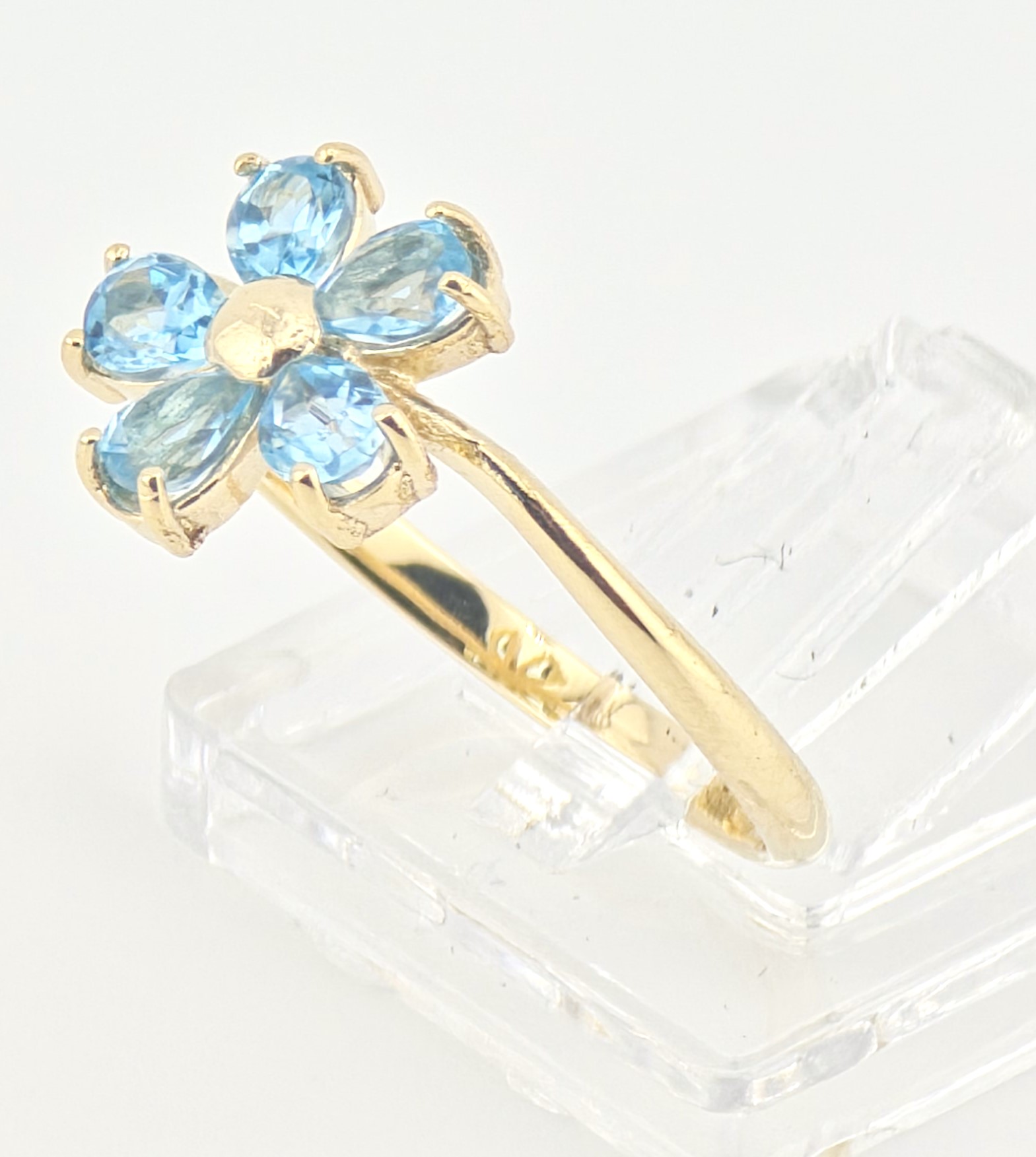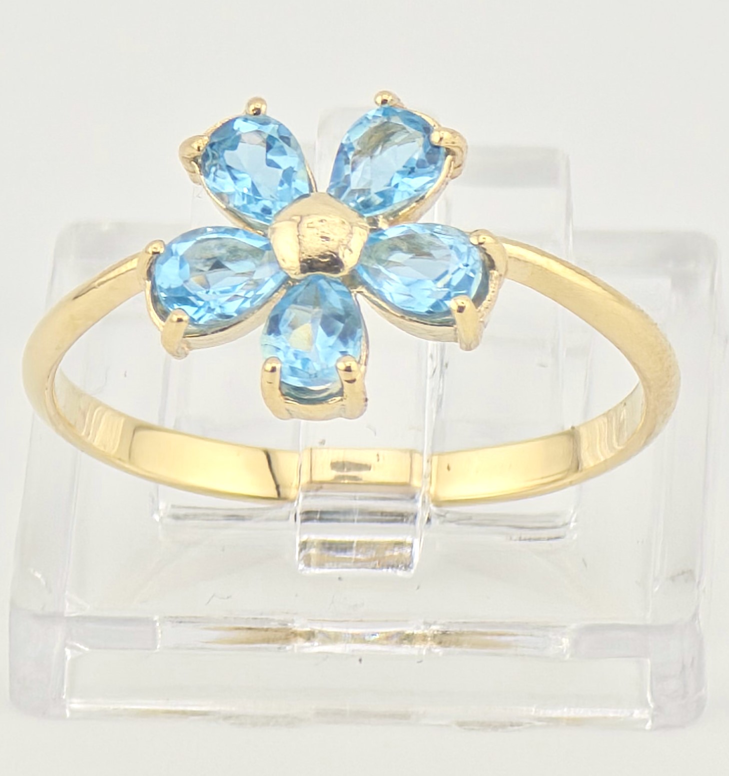 Bright, elegant, and full of charm, this 14K yellow gold flower ring features five pear-cut blue topaz gemstones arranged in a delicate floral design. Each stone sparkles with refreshing sky-blue color, creating a vibrant centerpiece that stands out beautifully against the polished gold band.