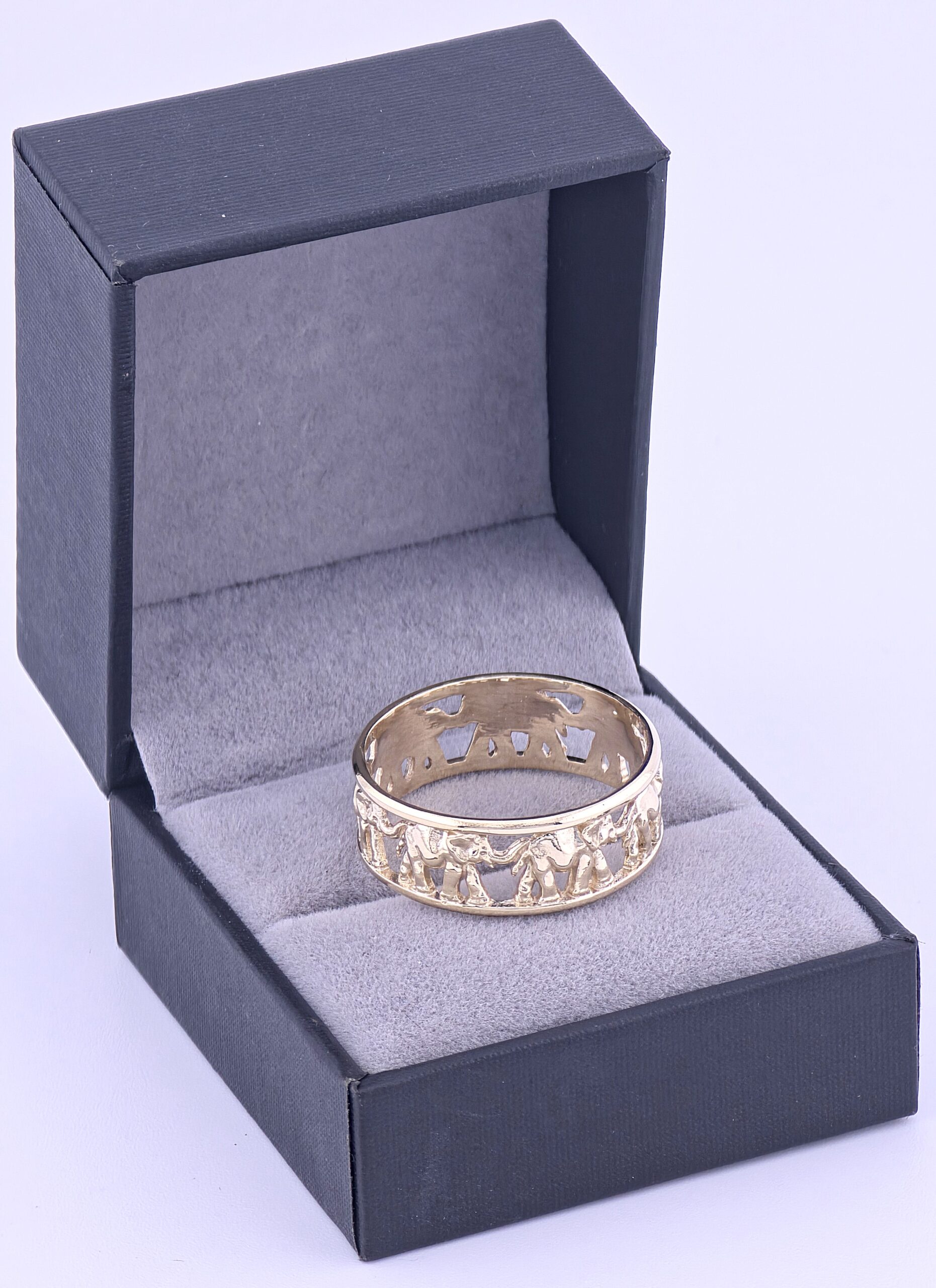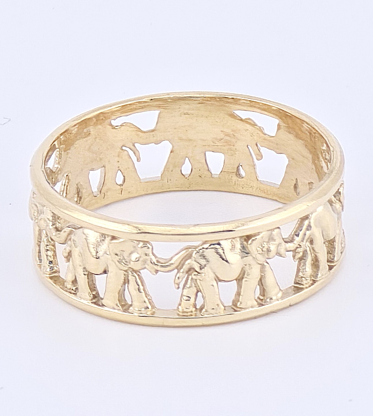 This beautifully crafted 14K gold elephant ring features a continuous band of detailed elephants symbolizing protection, good luck, and prosperity. Lightweight yet durable, this elephant band ring is perfect for daily wear and makes a meaningful gift for animal lovers and collectors of symbolic jewelry.