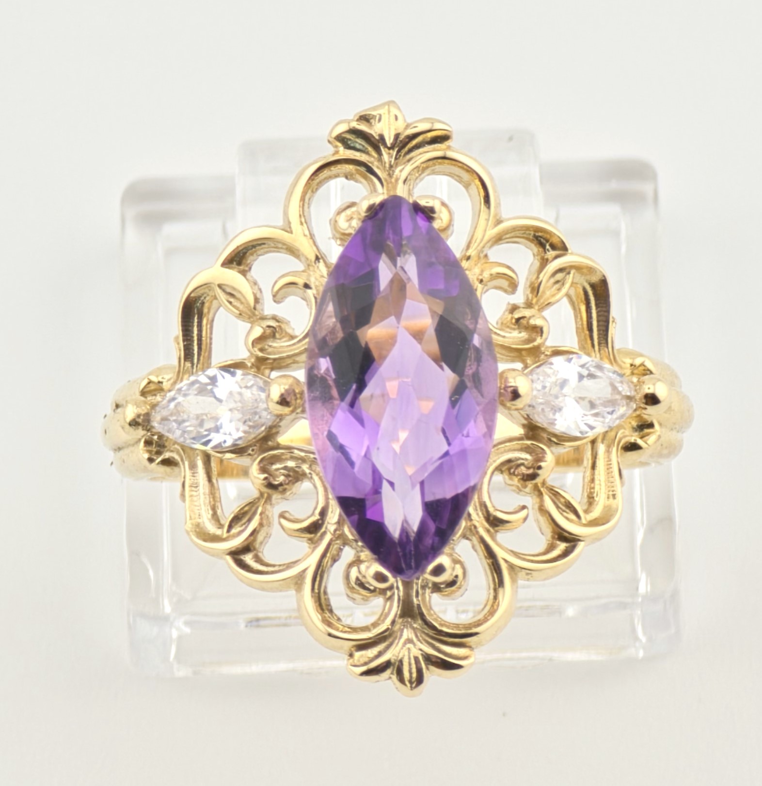 This stunning 14K yellow gold ring features a breathtaking marquise-cut amethyst set in an intricate vintage-style filigree design. Two sparkling cubic zirconia side stones add brilliance and balance, making this piece both elegant and eye-catching.