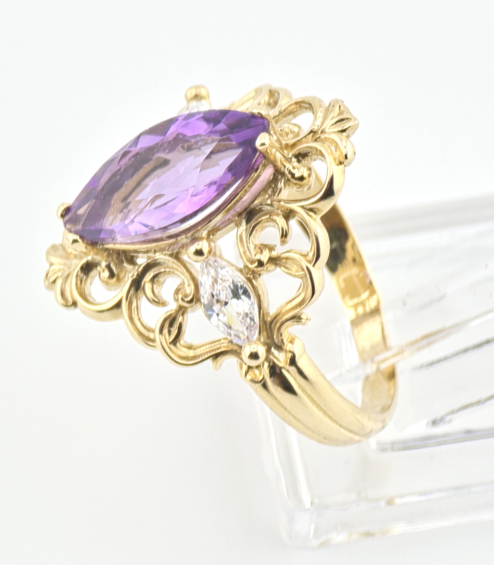 14K Yellow Gold Vintage-Style Amethyst Ring with CZ Accents